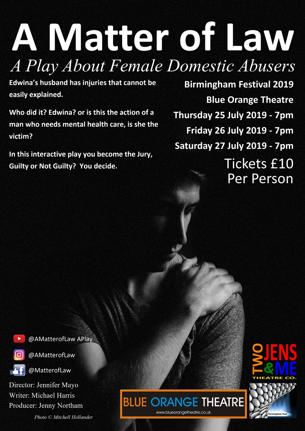 Michael had just published a novel 'Escape from Marriage' which told the story of a man who became the victim of domestic abuse, so the three decided that they would choose that as their subject. Having never written a full play before Michael agreed to give it a go - just over a week later the three met in Michael's flat for the first reading of the play award winning play which is now called ‘A Matter of Law’. The play allowed the audience to become the jury in the trial of an alleged Female Abuser and went on to win 'Best New Piece' at the 2019 Birmingham Fest.